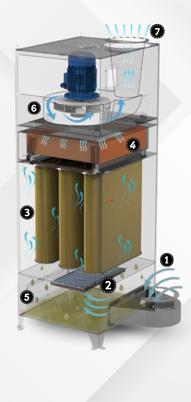 2- Türbülans kanatçıkları sayesinde büyük damlacıkları ayrıştırır sonrasında ön filtreler kaba partiküllerin ikincil filtrelere ulaşmasını engeller.